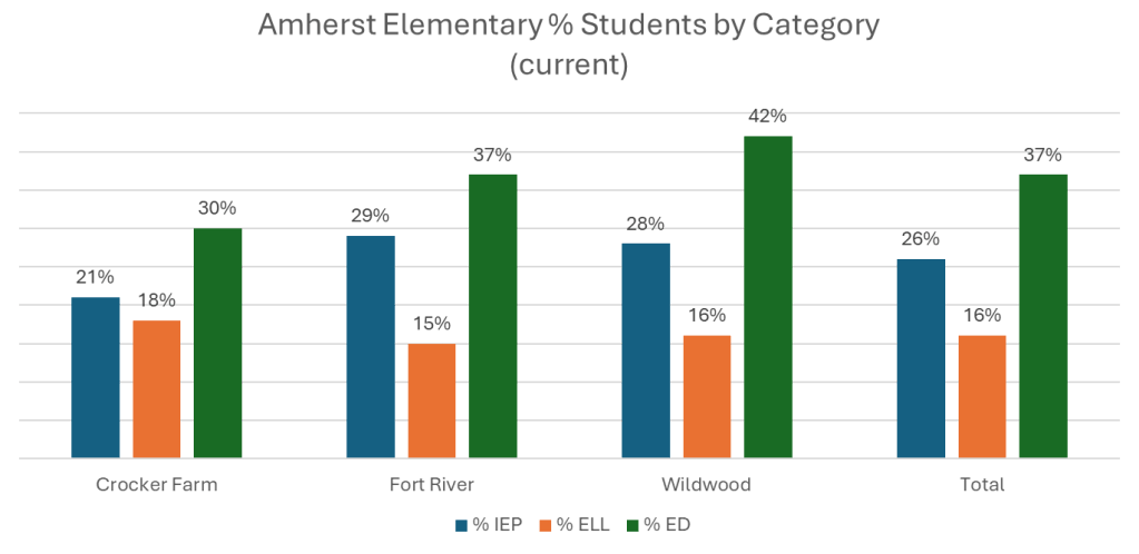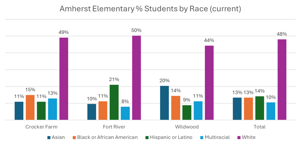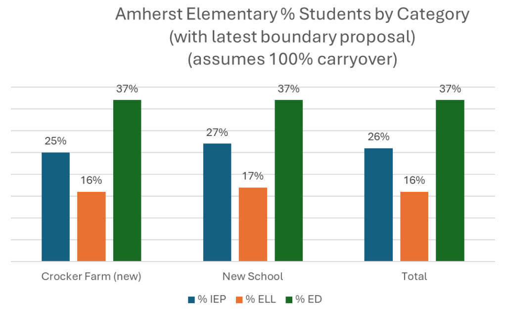 It’s important to note that this data reflects the assumption that all students who would be affected by the new boundary proposal would opt to stay in their current school. In reality, we don’t yet know how many or which students will opt to carry over in their current school. Please also note that these figures are different from what was reported in the Ammon presentation from the October 24 Amherst School Committee meeting; the figures in that presentation did not account for carry-over students.